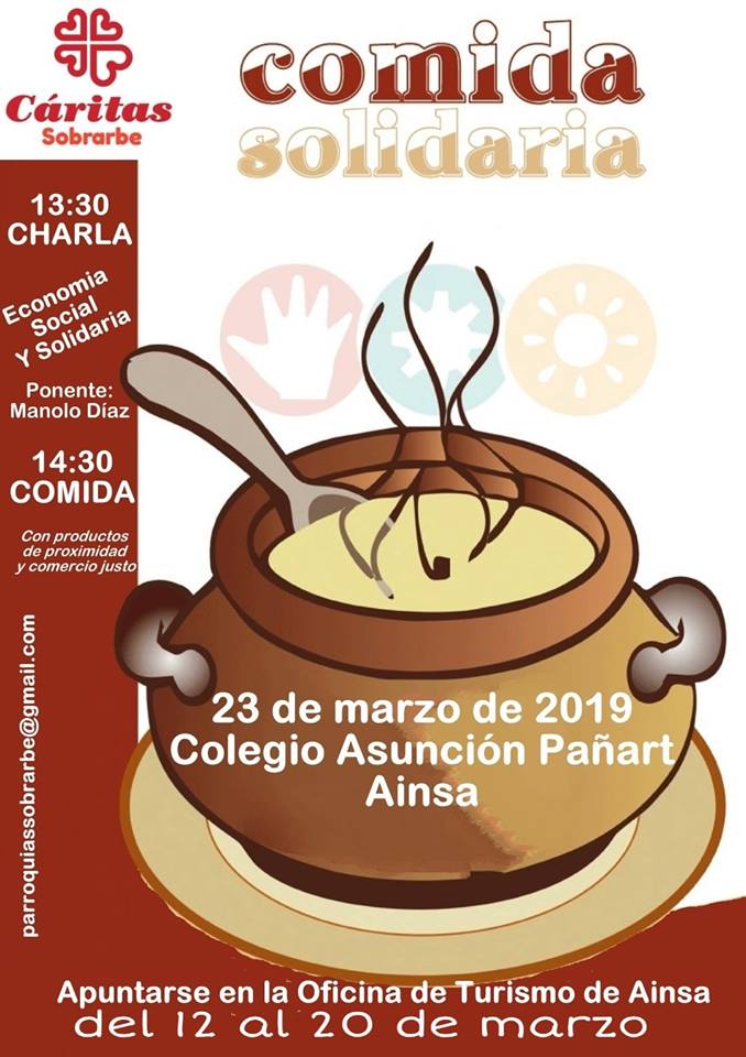 Hasta el día 20 se podrán adquirir en la Oficina de Turismo de Aínsa los tiques para la comida solidaria que se celebrara el 23 de marzo en el Colegio Asunción Pañart de Ainsa. Todo lo recaudado se destinara a los proyectos que atiende Cáritas en nuestra diócesis. También se instalará una hucha para donativos o aportaciones.