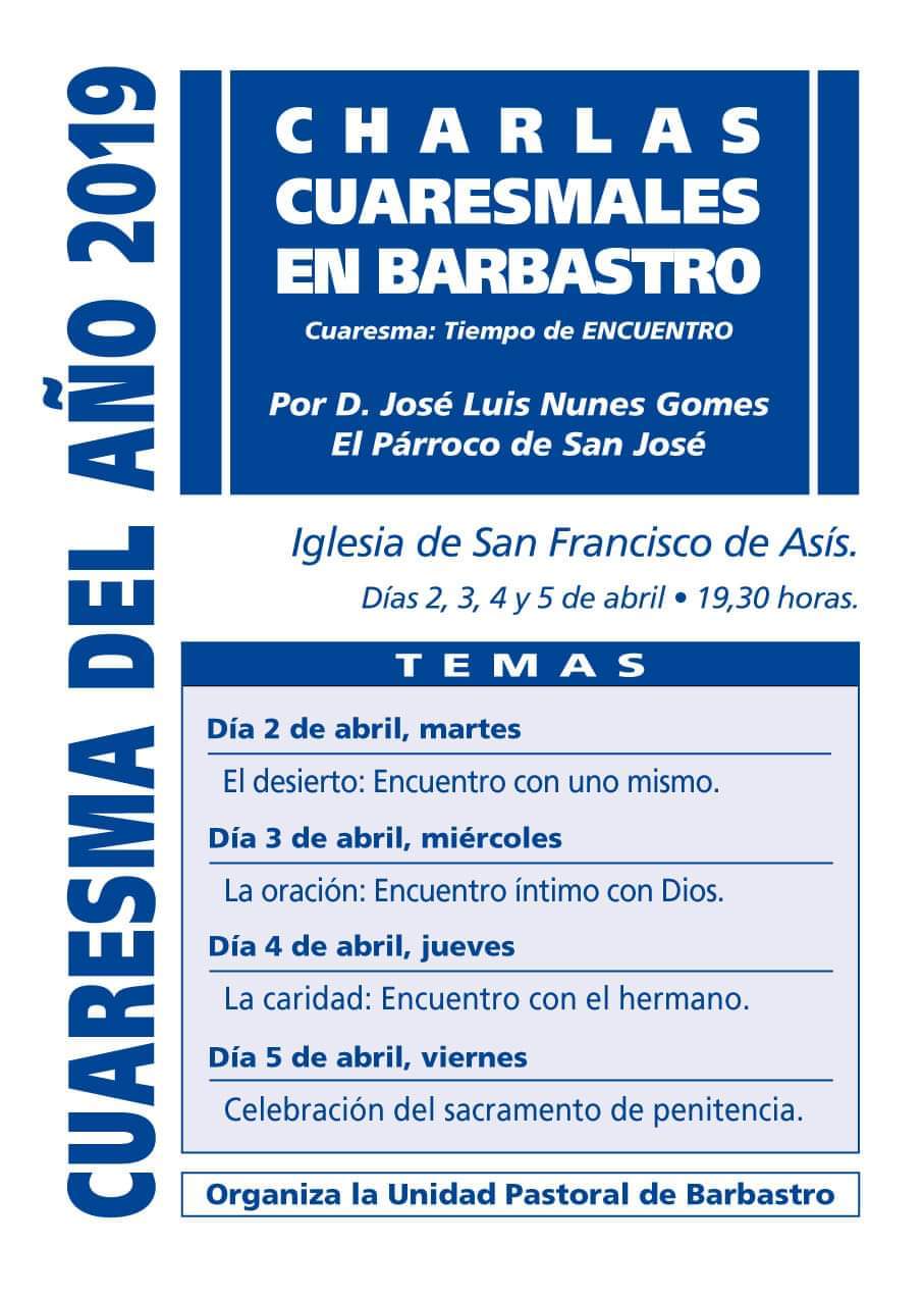 Los días 2, 3 y 4 de abril, van a tener lugar en Barbastro las Charlas Cuaresmales que se organizan conjuntamente por las tres parroquias de la ciudad. Tendrán lugar en la iglesia parroquial de San Francisco de Asís y darán comienzo a las 7,30 de la tarde. El viernes, día 5 de abril, también a las 7,30 de la tarde, se concluyen con una celebración comunitaria del sacramento de la Penitencia. Las reflexiones de estos días van a estar dirigidas por don José Luis Nunes, párroco de la Parroquia de San José.