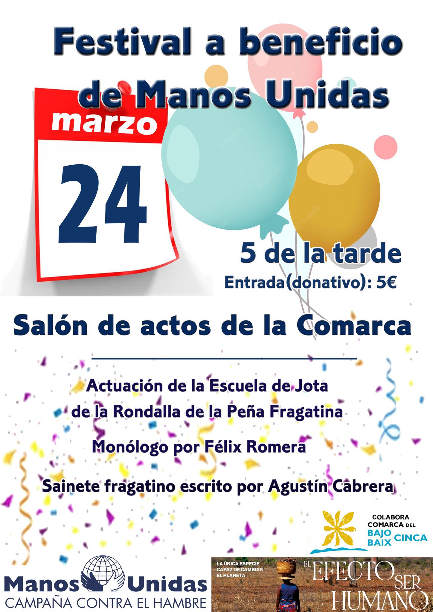 El día 24, Festival a beneficio de Manos Unidas en el Salón de Actos de la Comarca del Bajo Cinca de #Fraga