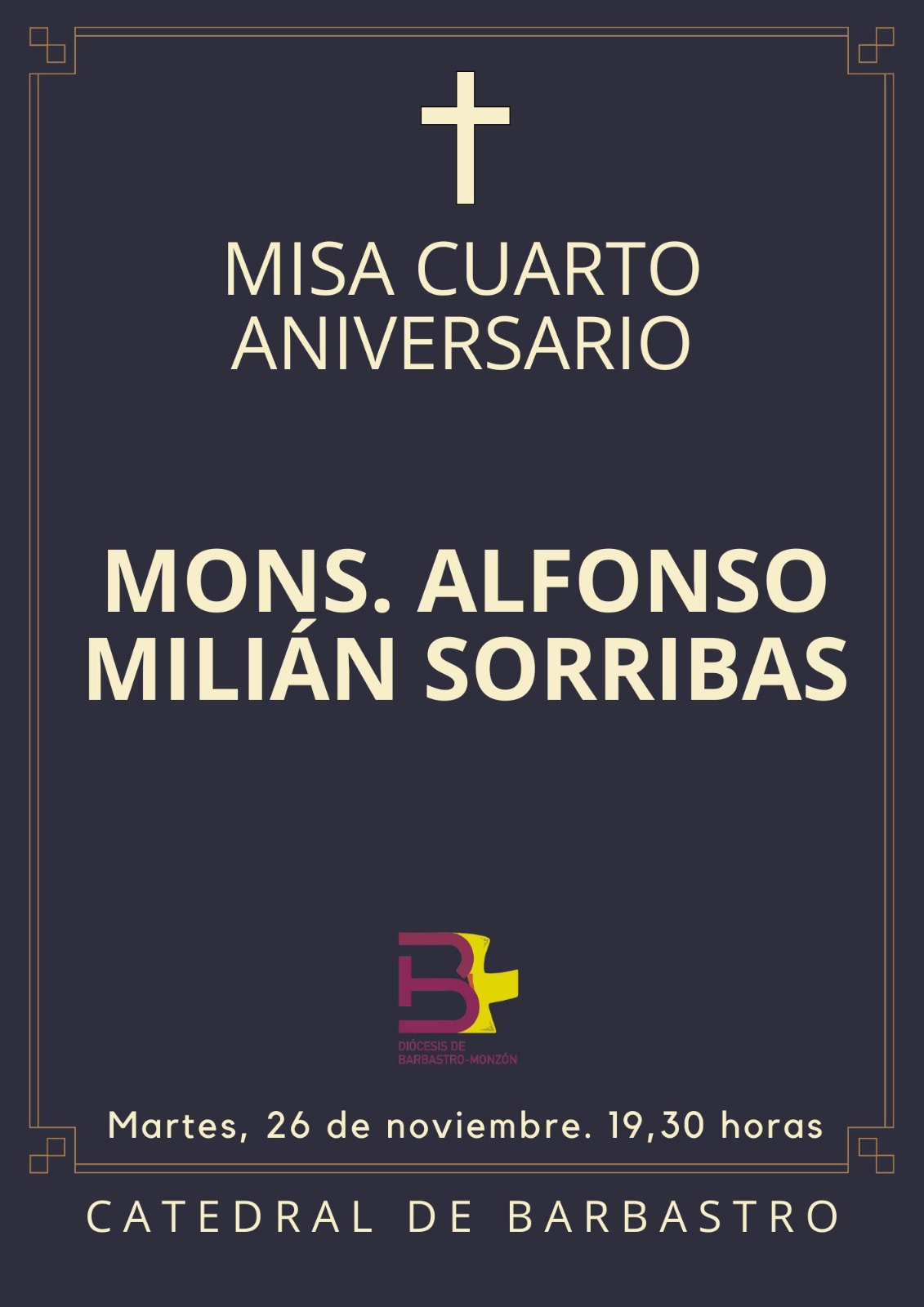 El martes, 26 de noviembre, se cumplen cuatro años del fallecimiento de Mons. Alfonso Milián, obispo emérito de esta diócesis. La Catedral de Barbastro acogerá una misa aniversario a las 19.30 horas, presidida por don Ángel.