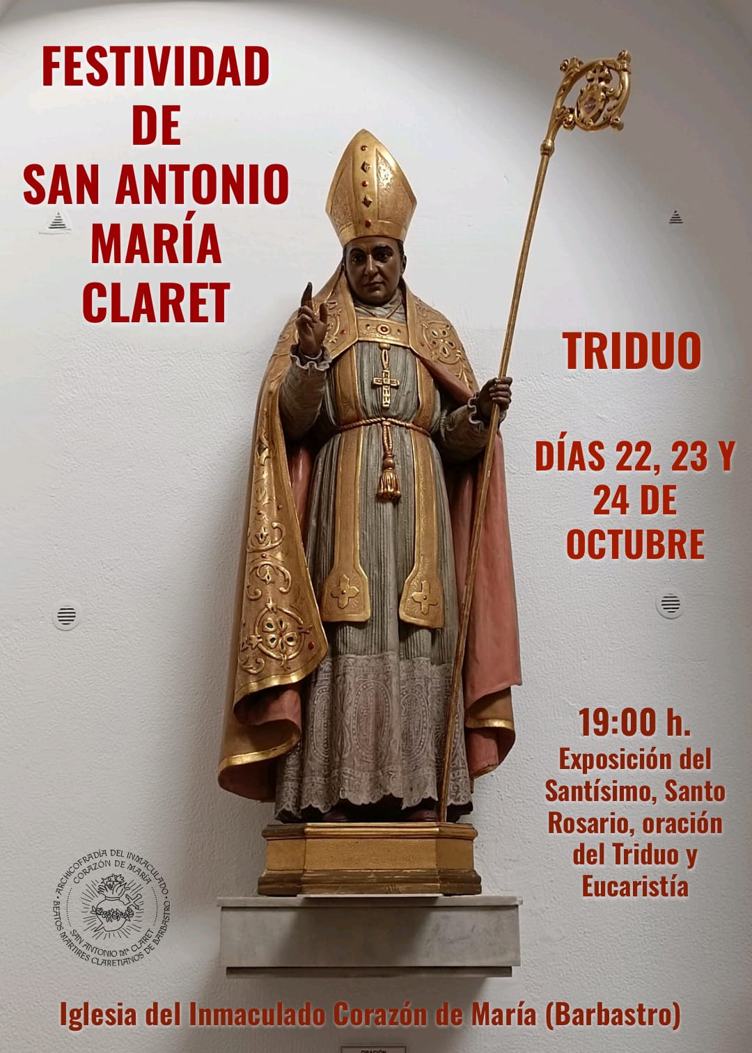 La Archicofradia del Inmaculado Corazón de María, Beatos Mártires claretianos de Barbastro y San Antonio María Claret organiza un triduo en honor al fundador de los Claretianos.