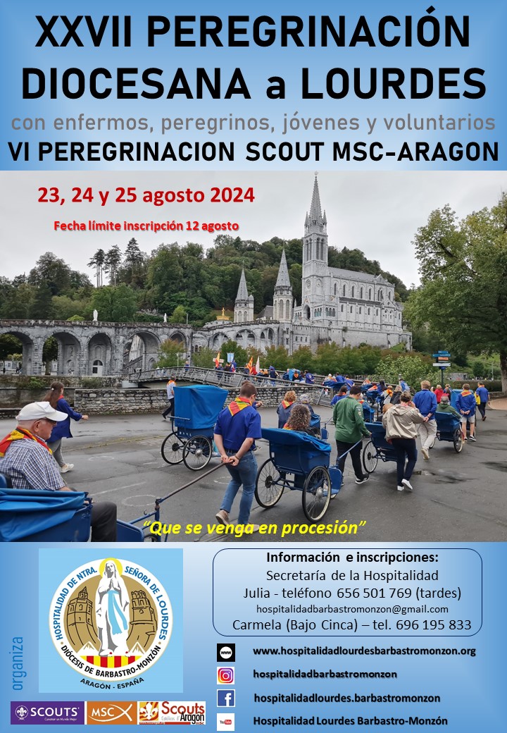 Del 23 al 25 de agosto se desarrollará la XXVII peregrinación diocesana al santuario mariano de Lourdes. Está organizada por la Hospitalidad Diocesana de Nuestra Señora de Lourdes y se complementa con la VI peregrinación del Movimiento Scout Católico de Aragón. Información e inscripciones (hasta el 12 de agosto): Secretaría 656501769 (Julia-tardes) hospitalidadbarbastromonzon@gmail.com y 696195833 (Carmela-Bajo Cinca).