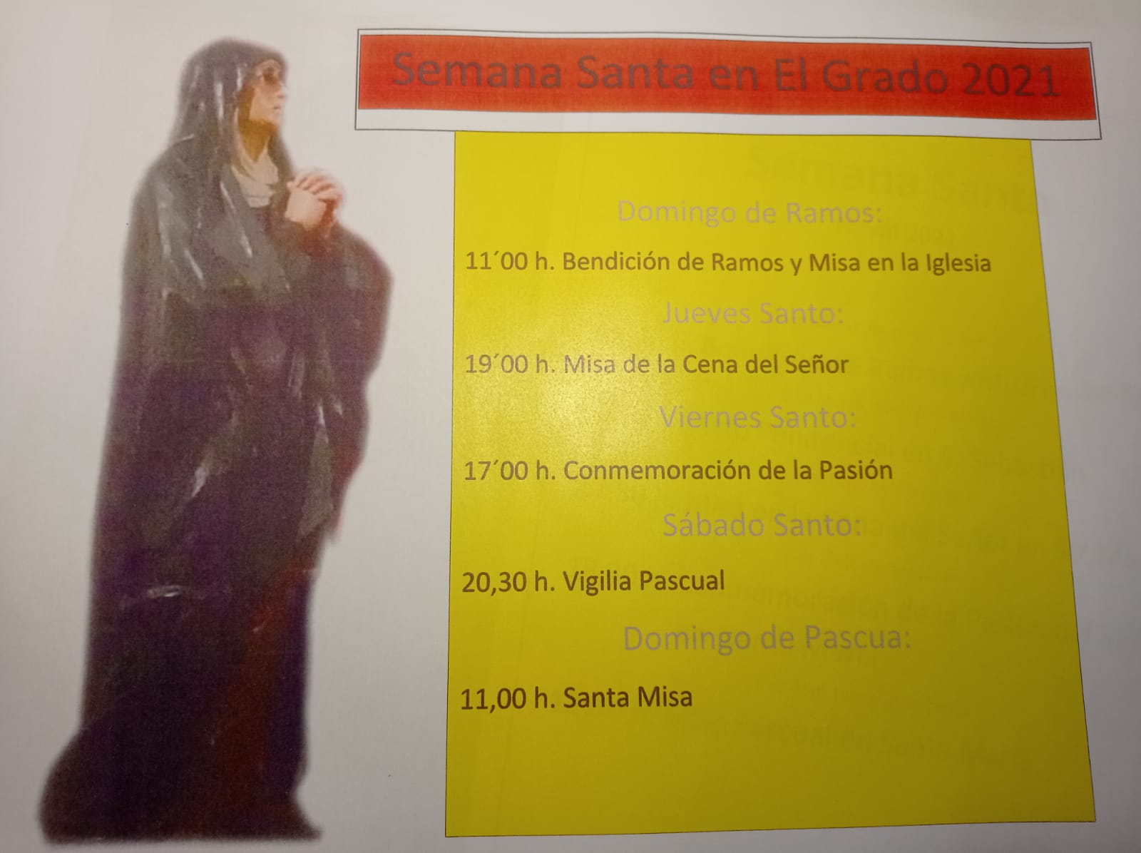Celebraciones Semana Santa 2021. El Grado Mar 28 28 Mar, 2021, 11:00 - 4 Abr, 2021, 11:00 Celebraciones Semana Santa 2021. El Grado