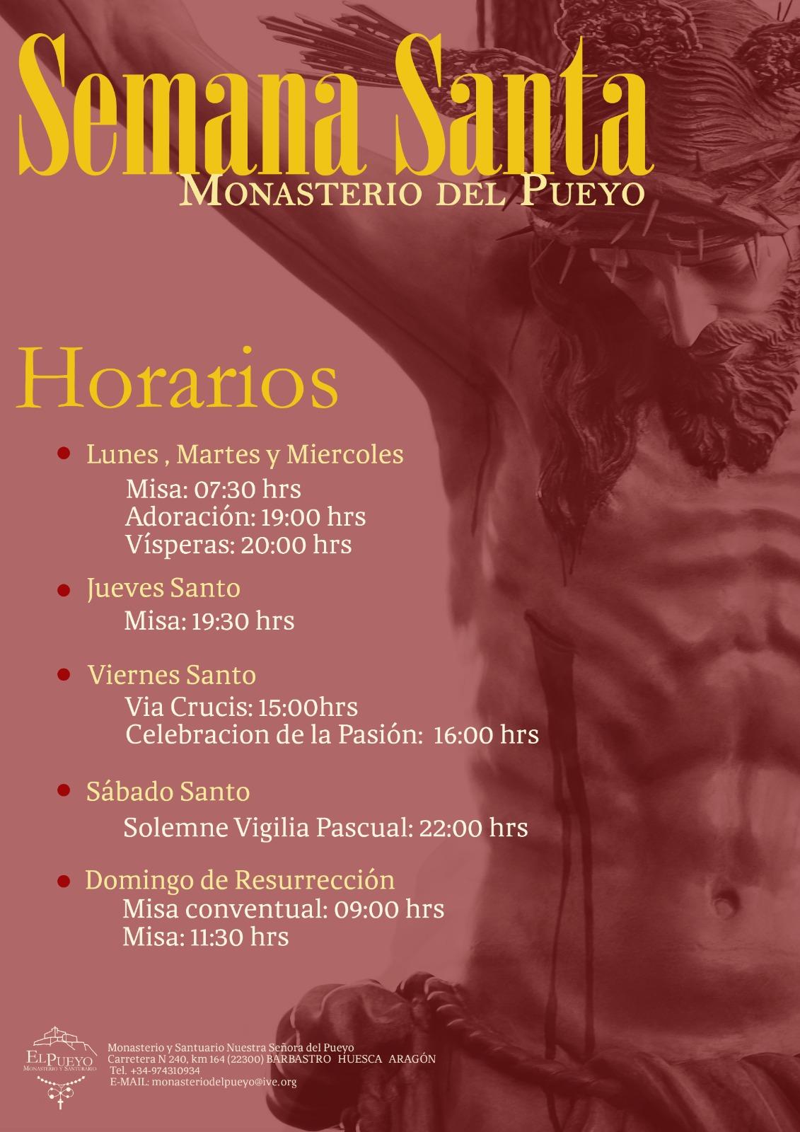 Celebraciones Semana Santa 2021. Monasterio de El Pueyo Mar 29 29 Mar, 2021, 07:30 - 4 Abr, 2021, 17:00 Celebraciones Semana Santa 2021. Monasterio de El Pueyo
