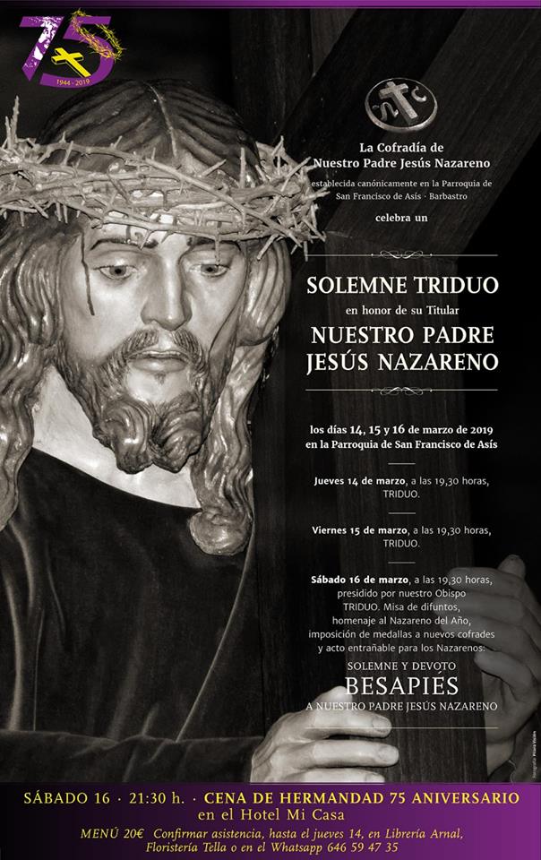 Mar 15 15 Mar, 2019, 19:30 - 16 Mar, 2019, 21:30 Triduo en Honor a Nuestro Padre Jesús Nazareno. Barbastro Iglesia de San Francisco Barbastro Evento Details Get Directions
