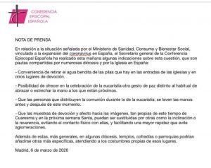 El Obispado de Barbastro-Monzón hace suyas las disposiciones comunicadas por la Conferencia Episcopal Española a las 17.00 horas de este viernes, 6 de marzo, a través de la siguiente nota de prensa:
