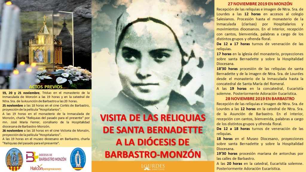 Monzón Monzón.- 12 h.: Recepción de las Reliquias de Santa Bernardita e imagen de la Virgen de Lourdes en los accesos al Colegio de los Salesianos. Desde allí, procesión hasta el Monasterio de las Hnas. Clarisas. La urna con las Reliquias y la imagen de la Virgen de Lourdes serán llevadas por miembros de la Hospitalidad […]