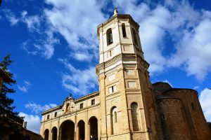 San Ramón obispo de Roda y Barbastro reconstruyó en gran parte esta catedral, en la actualidad uno de los edificios más emblemáticos del románico aragonés. Sus restos descansan en el magnífico sarcófago tallado que sirve de altar en la cripta. Su noble estructura, su riqueza escultórica, su abundancia pictórica, sus textiles únicos en el románico aragonés y su claustro de laudas funerarias lo convierten en el claustro más rico del mundo y hacen de Roda el lugar más emblemático del románico.